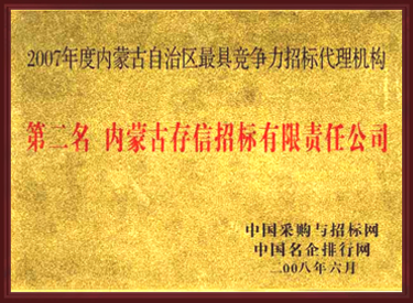• 2008年度內蒙古自治區最具競爭力招標代理機構第一名